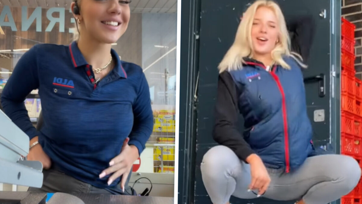 De Duitse ALDI gaat flink stormlopen komende tijd, want één van hun kassières is haarzelf lekker in de etalage aan het gooien op TikTok. Tijdens de pauze doet ze soms wat dansjes in het magazijn, of ze filmt verleidelijke content vanachter de kassa.