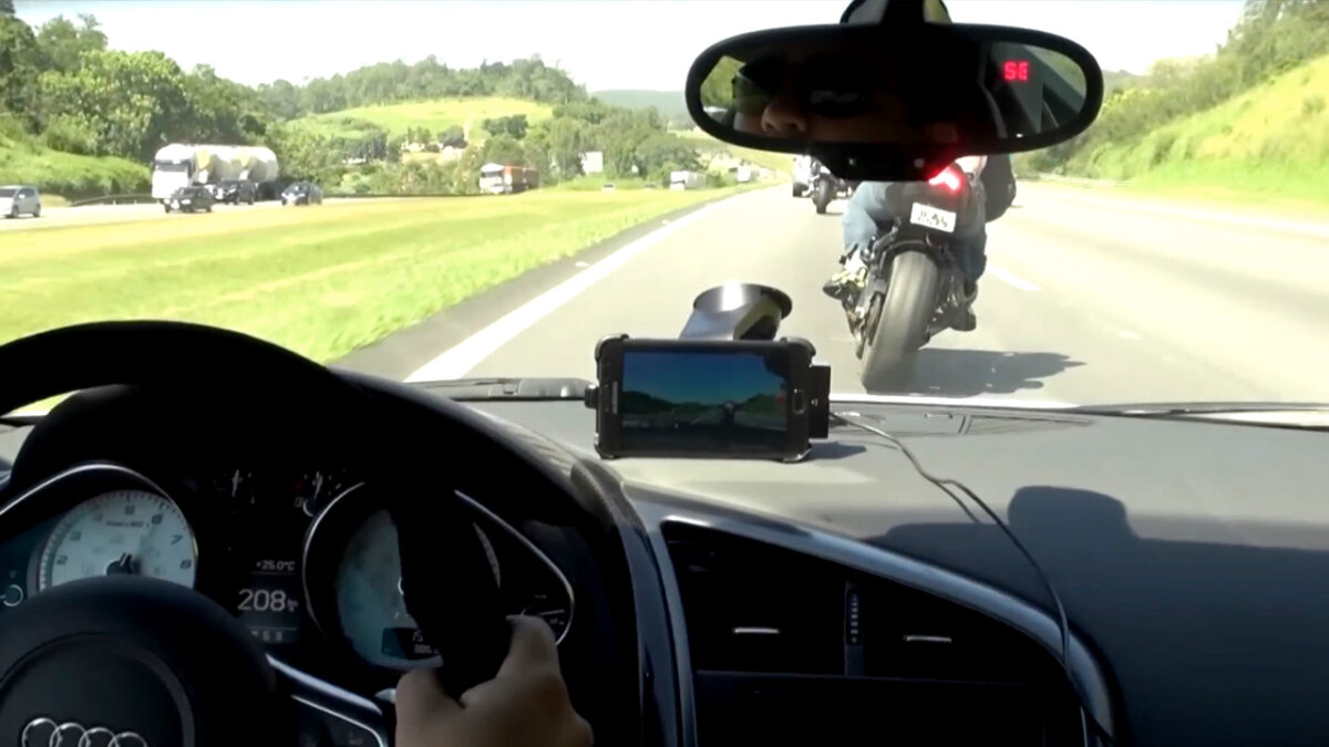 Braziliaanse patser in Audi R8 daagt twee motorrijders uit en krijgt een pijnlijke reality check
