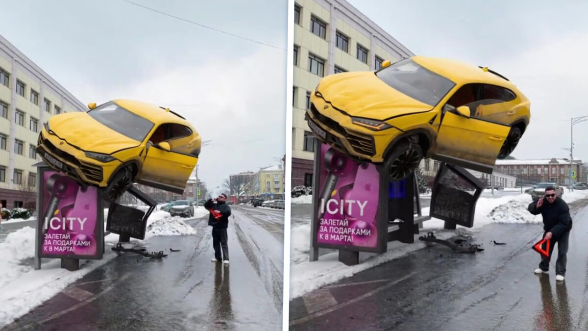 Russische brokkenpiloot parkeert zijn Lamborghini Urus bovenop een bushokje
