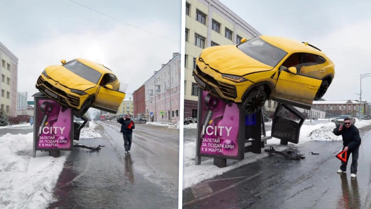Russische brokkenpiloot parkeert zijn Lamborghini Urus bovenop een bushokje