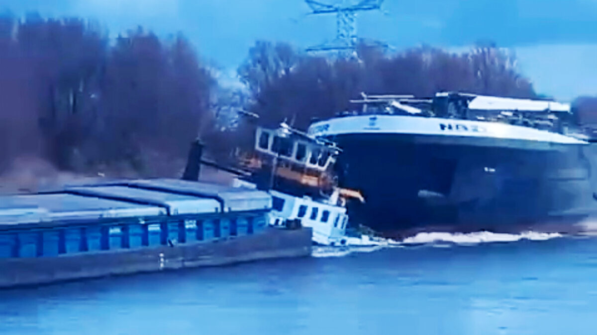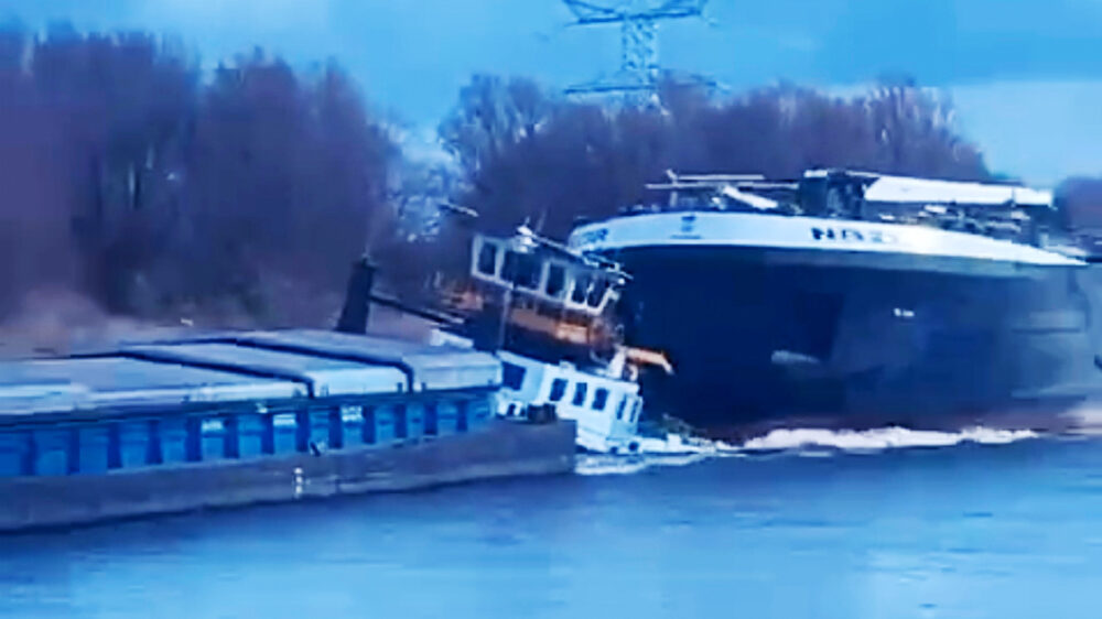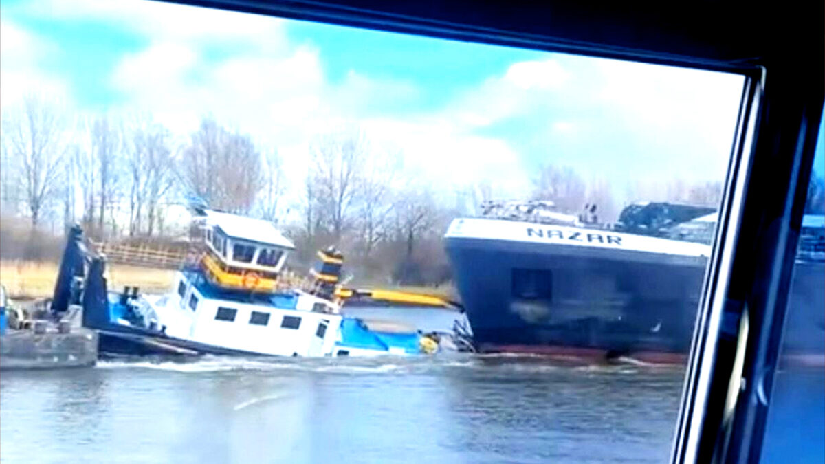 Op de video is te zien hoe de tanker de duwboot van achteren een flinke zet geeft en ‘m daarna bruut onder water probeert te duwen. Een soort Titanic, maar dan zonder orkest en paniek. AMS Barging bevestigt dat de aanvaring heeft plaatsgevonden, maar gelukkig bleef het bij een nat pak en kwam iedereen er zonder kleerscheuren vanaf.