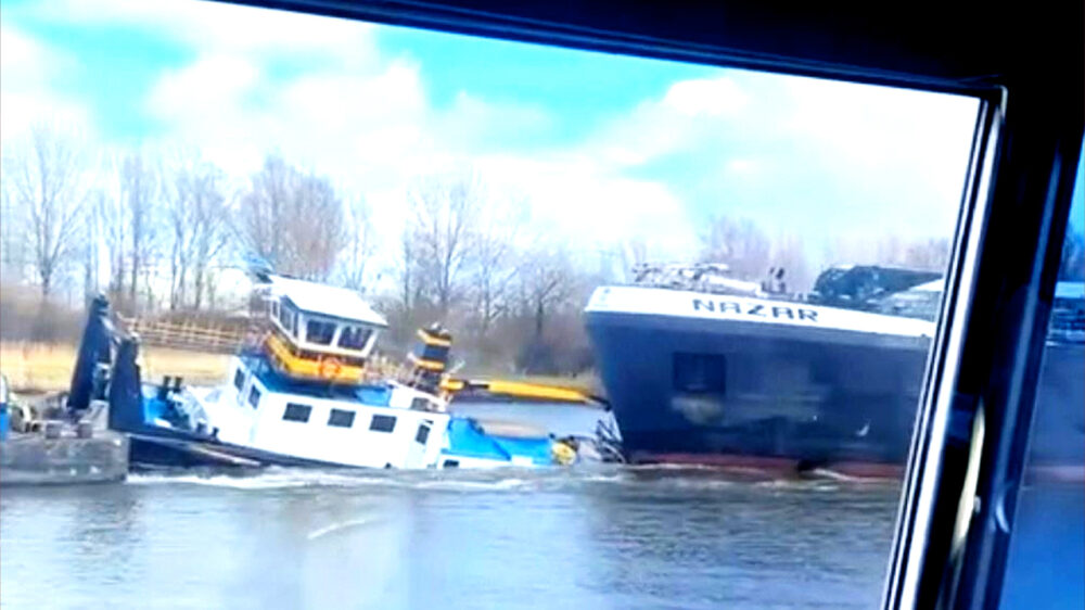Op het Amsterdam-Rijnkanaal kreeg een duwboot gisteren een ongevraagde onderwaterervaring dankzij de gigantische binnenvaarttanker Nazar van AMS Barging.