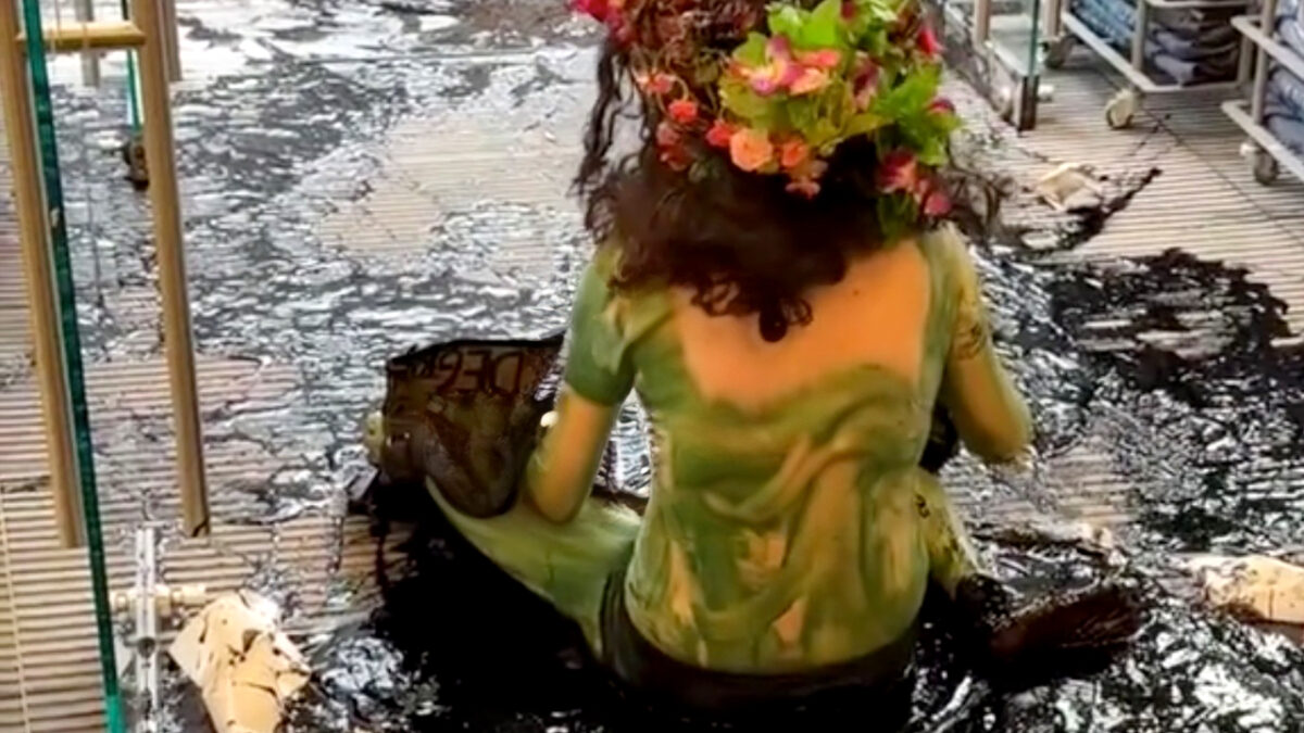 Het zwarte spul moest olie en fossiele brandstoffen voorstellen, om zo een punt te maken over de vervuiling van de kledingindustrie. Alleen een beetje jammer dat ze niet helemaal hadden nagedacht over de gevolgen: twee meisjes kregen de smurrie ook over zich heen en waren daar niet zo blij mee. Zij hebben aangifte gedaan en de actievoerders mochten mee voor een gratis ritje naar het politiebureau.