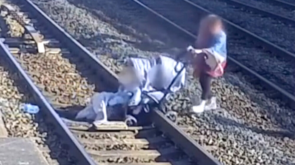 De Belgische spoorwegen hebben beelden vrijgegeven van een moeder die haar kinderwagen met twee kinderen over de treinsporen sleept in Sint-Niklaas.