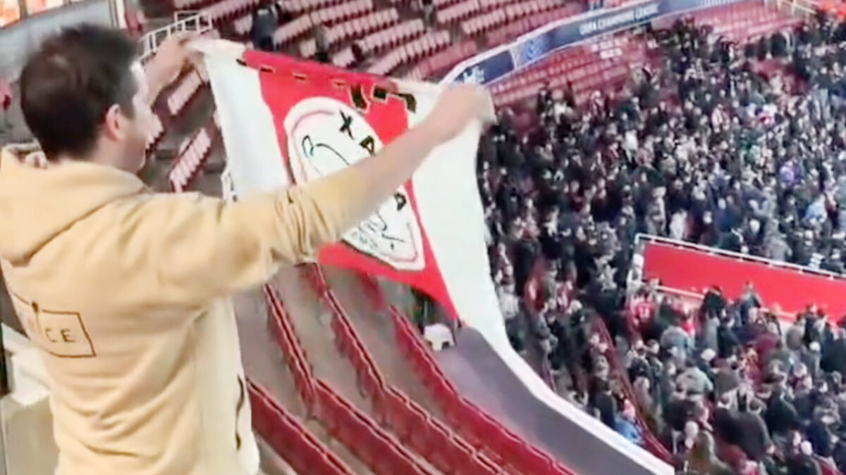 PSV-supporters pesten in Londen: Fan provoceert uitvak met een vlag van Ajax