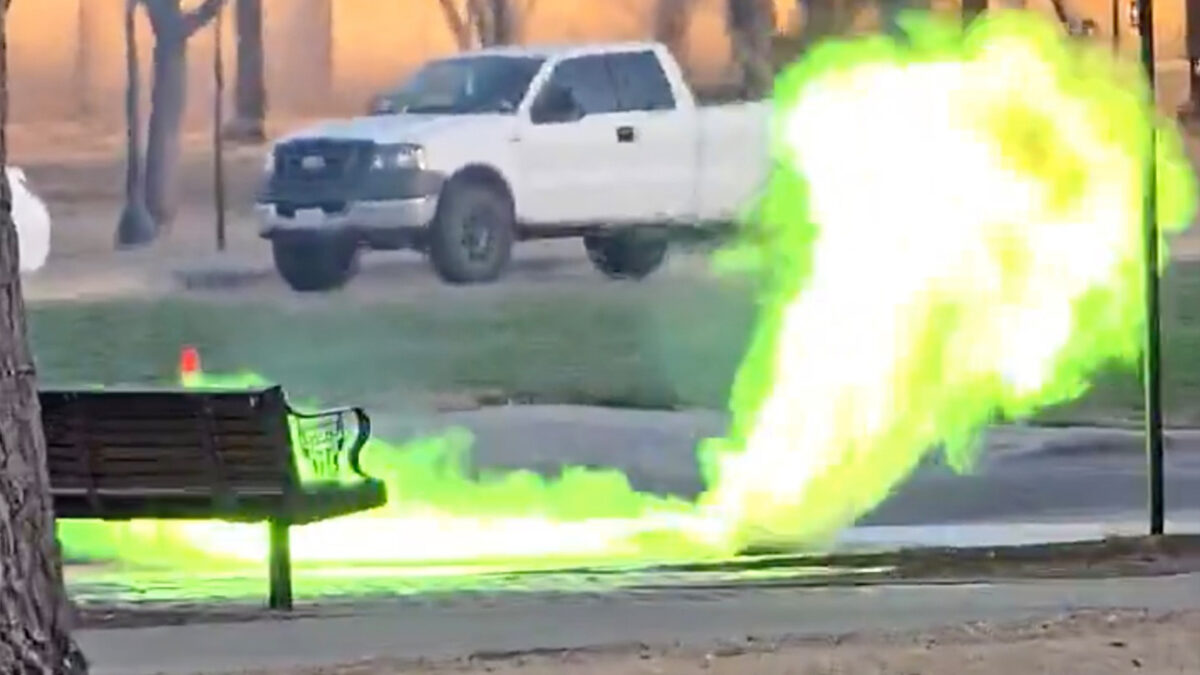 Op een universiteit in Texas werden studenten getrakteerd op een onverwacht spektakel: felgroene vlammen die uit een putdeksel spoten alsof de hel zich eronder opende.