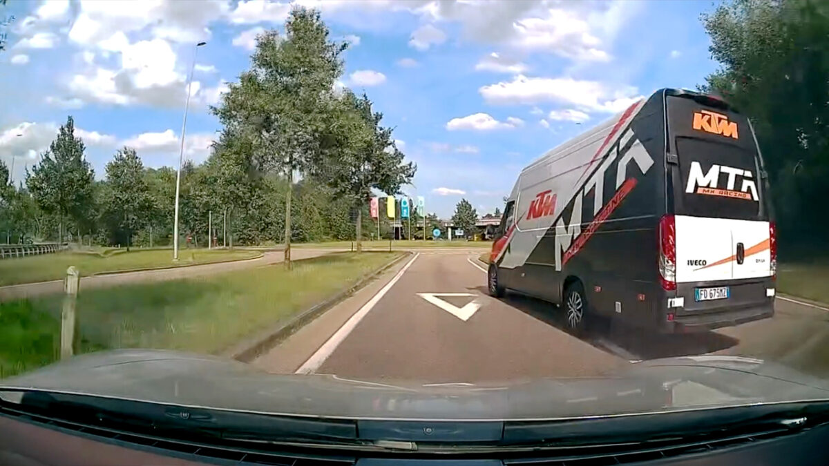 Blind Belgisch busje besluit op het laatste moment tóch de rotonde te pakken