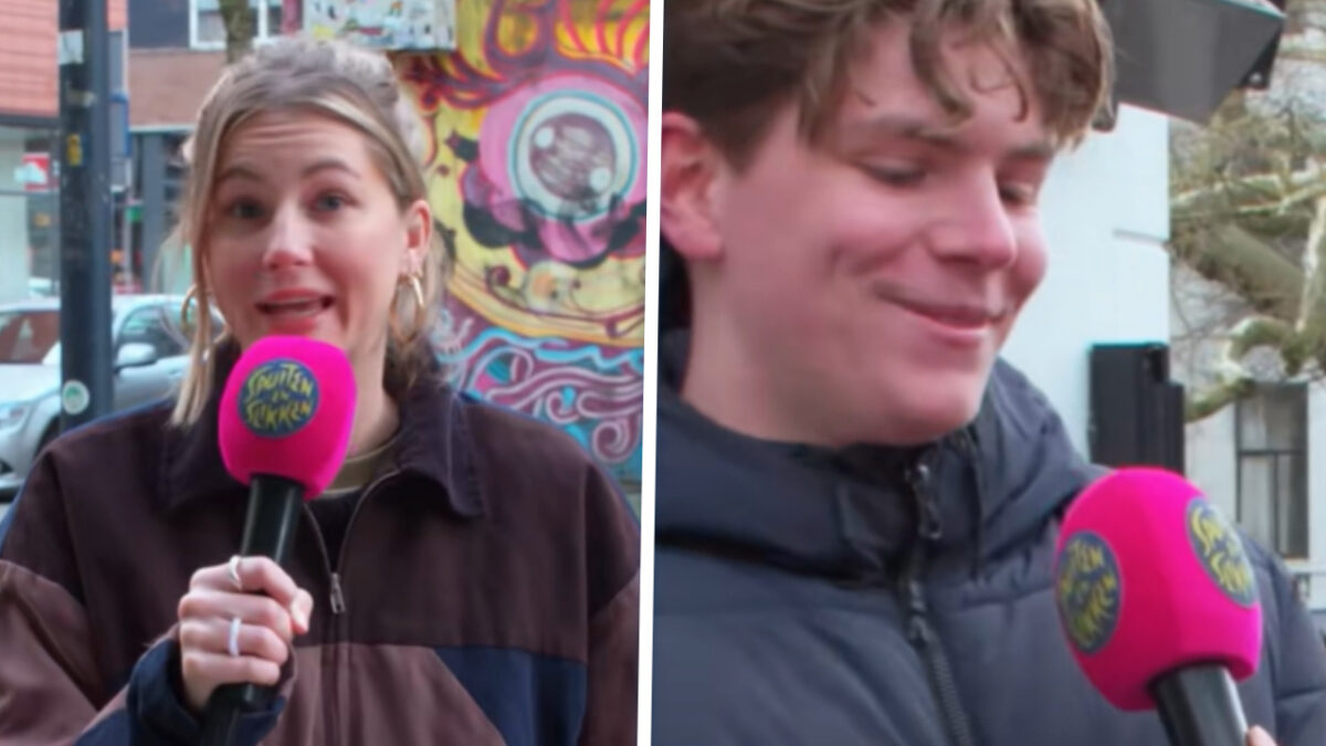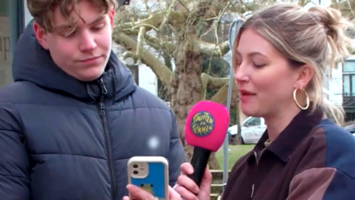 Presentatrice trotseert de straat met fotokopie van d'r vleesvlinder en laat mannen beoordelen