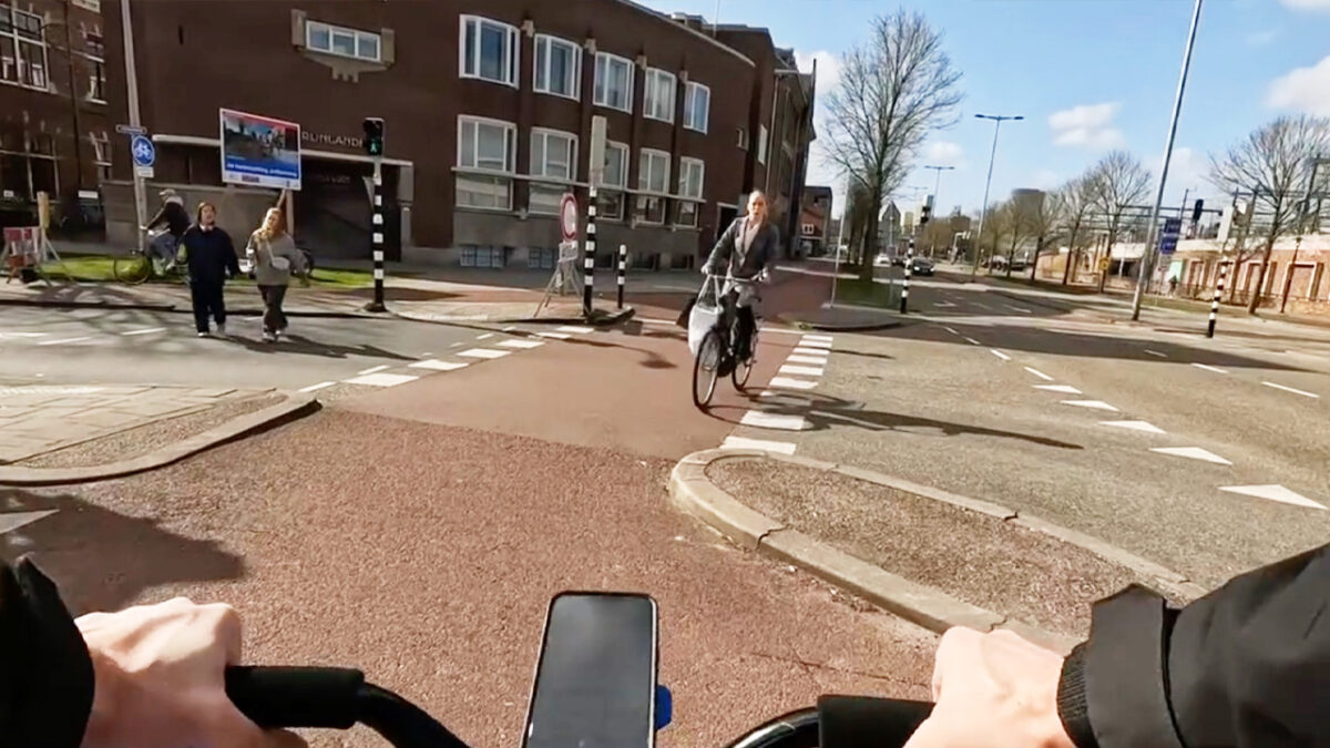 De vrouw in kwestie had waarschijnlijk een rustig ritje voor ogen, tot deze fietstornado uit het niets haar dag kwam verpesten.