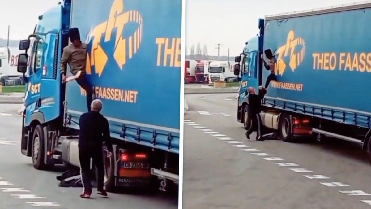 Vrachtwagenchauffeur heeft geen zin in illegale lifters en sleurt 'm er eigenhandig uit