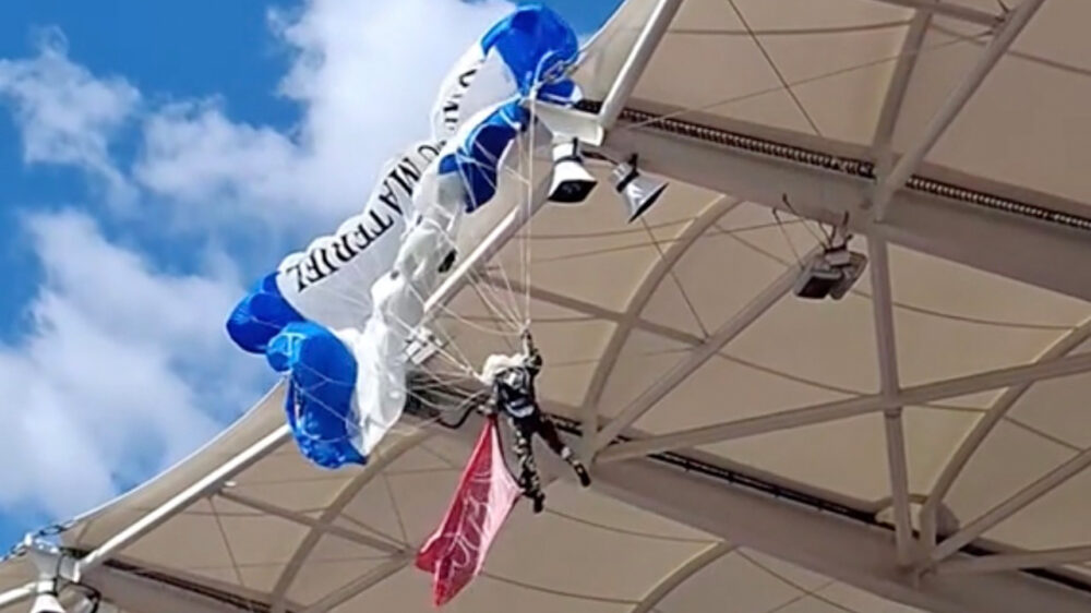 Parachutist raakt verstrikt in dak van stadion en bungelt als wasgoed 15 meter boven de grond