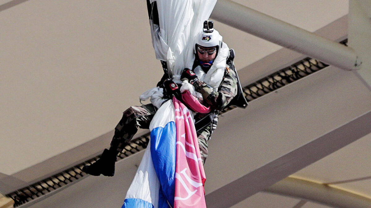 Een Franse militair raakte met de rechterkant van z'n parachute verstrikt in de bovenste ring van het stadion, waardoor hij zo'n 15 meter boven een stel verbaasde toeschouwers bungelde als een vleesgeworden vlag.
