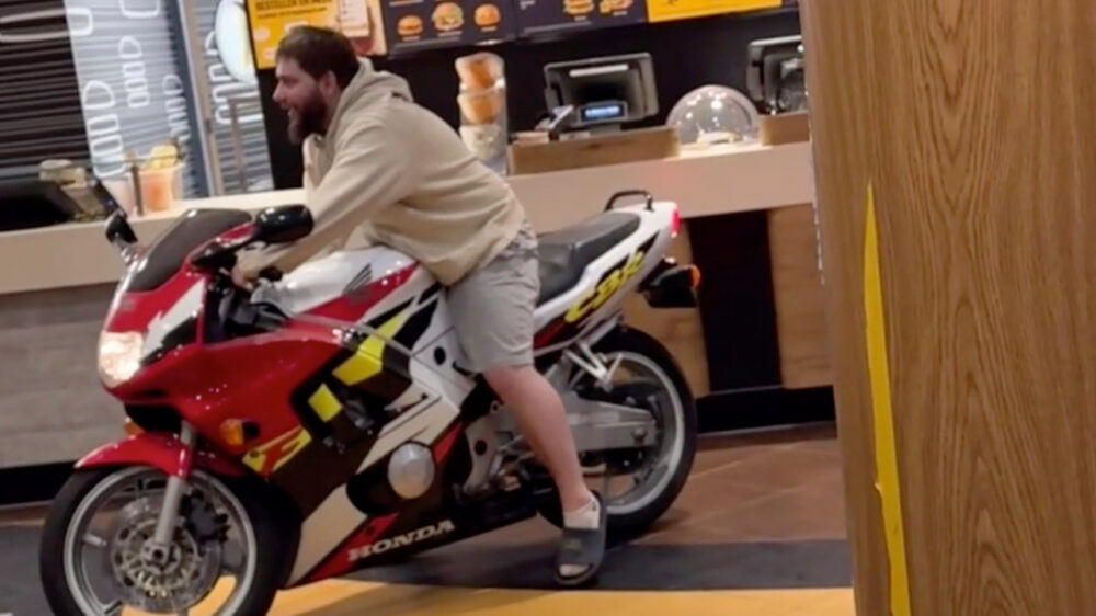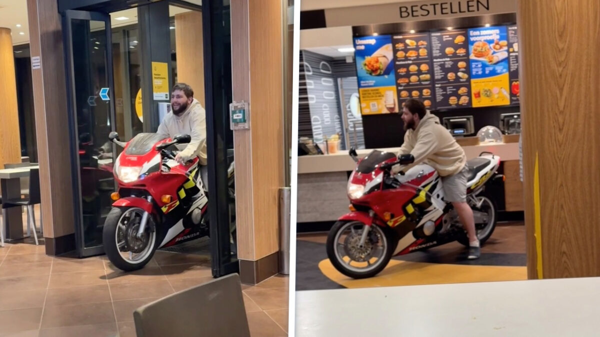 Je hebt mensen die gewoon een hamburger scoren en je hebt mensen die met hun motor dwars door de 'McDrive' naar binnen knallen alsof het een potje GTA is. In Leiderdorp besloot deze motortokkie dat ook de voordeur van de McDonald's wel als drive-through kon fungeren en dat moest natuurlijk ook op video worden vastgelegd.