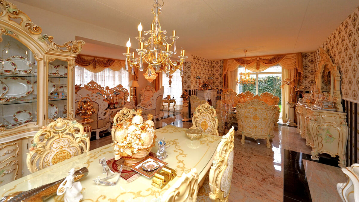 Dit paleisje is zó over de top, dat zelfs de Efteling een stapje terug zou doen. Alles goud wat er blinkt, plus porselein, glitters, tierelantijnen en tapijten die rechtstreeks uit een Turkse bruiloft lijken te komen. Geen smaak? Geen probleem! Hier woon je niet, hier lééf je een droom... als je droom toevallig ‘woonwagenkamp op stand’ is.