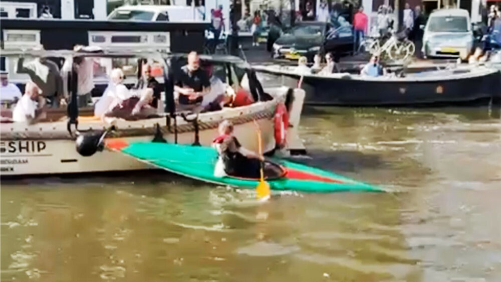 Op een Amsterdamse gracht werd een kanoër even niet helemaal gezien, waarschijnlijk hadden ze er gewoon ouderwets schijt aan, door een sloep vol mensen die waarschijnlijk nét iets te veel vertrouwen hadden in hun stuurmanskunsten. Iedereen bleef deze keer wel ongedeerd maar niet helemaal droog. Gelukkig hebben we de beelden nog.