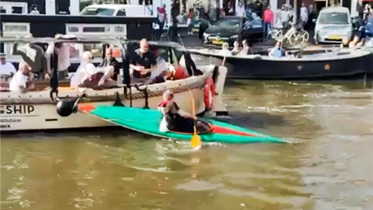 Op een Amsterdamse gracht werd een kanoër even niet helemaal gezien, waarschijnlijk hadden ze er gewoon ouderwets schijt aan, door een sloep vol mensen die waarschijnlijk nét iets te veel vertrouwen hadden in hun stuurmanskunsten. Iedereen bleef deze keer wel ongedeerd maar niet helemaal droog. Gelukkig hebben we de beelden nog.