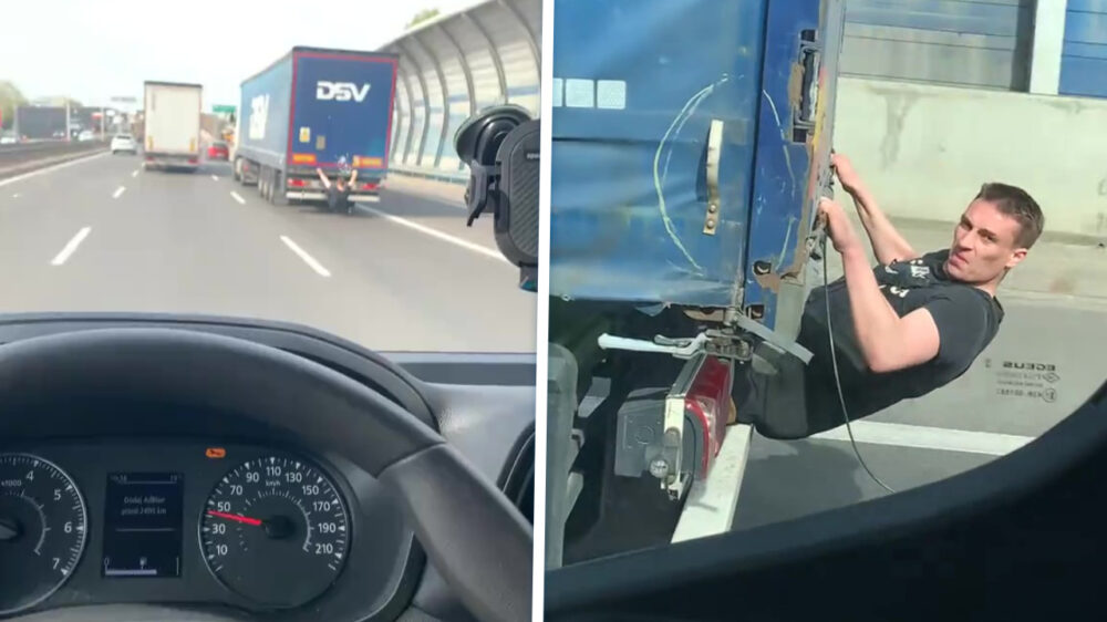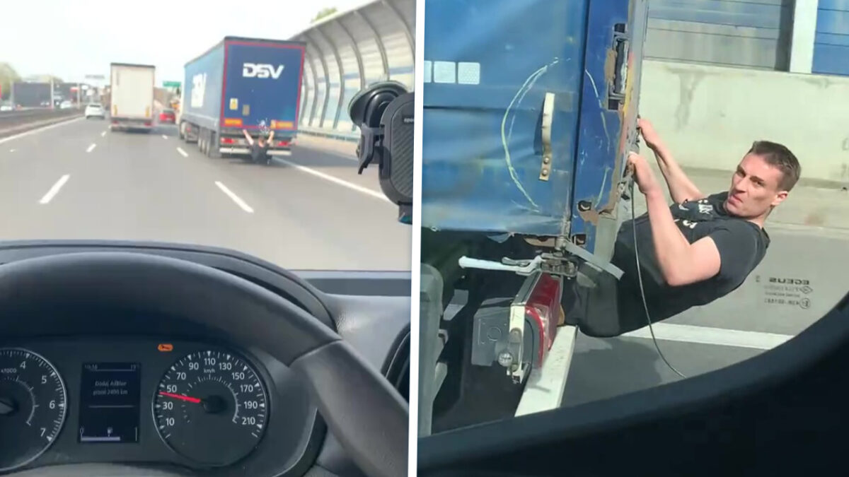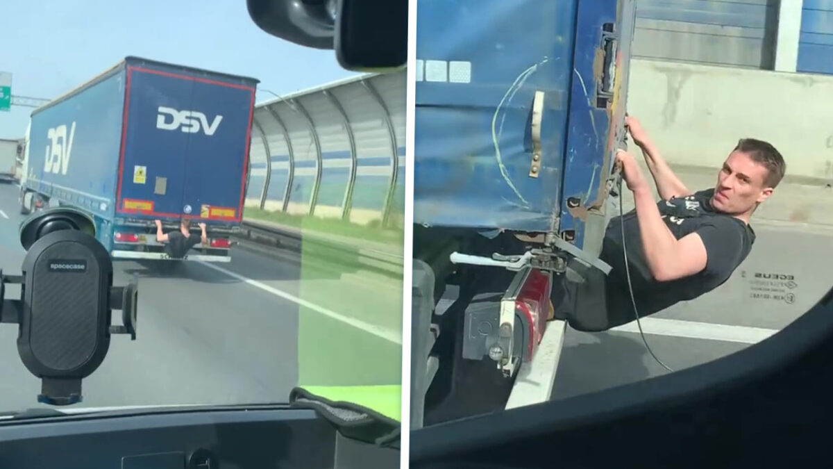 Wat deze gozer precies bezielde, weet niemand. Bus gemist? Tinderdate op standje spoed? Geen idee, maar als je als een soort menselijke bumperklever aan een vrachtwagen hangt op de snelweg, dan is er toch echt iets niet helemaal lekker aangesloten daarboven.