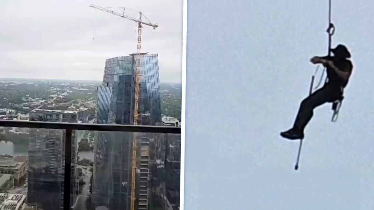Man slingert als menselijke wrecking ball aan een bouwkraan in Austin, Texas
