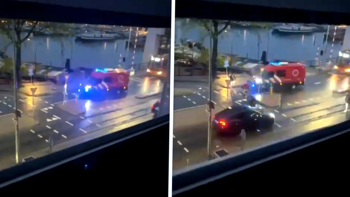 Brandweerwagen met loeiende sirene's tegengehouden door malloot in Amsterdam