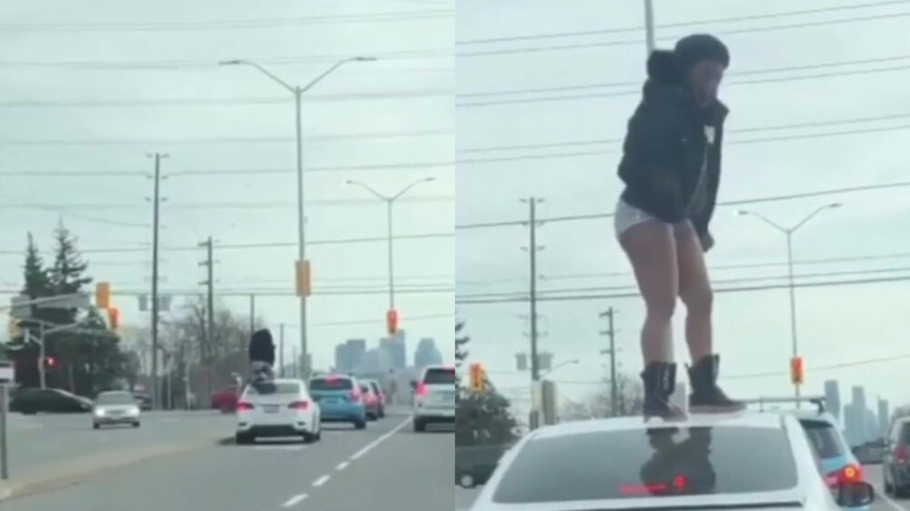 We zijn er nog niet helemaal uit of deze vrouw nou vrijwillig op het dak lag en haar kerel een lesje wilde leren, of dat haar kerel er genoeg van had en wegreed terwijl mevrouw nog op het dak zat. Hoe dan ook, dit zie je niet elke dag op de weg.