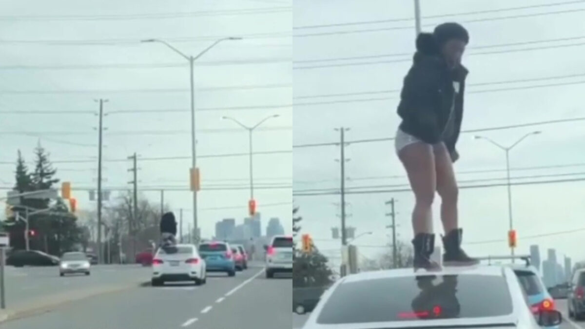 We zijn er nog niet helemaal uit of deze vrouw nou vrijwillig op het dak lag en haar kerel een lesje wilde leren, of dat haar kerel er genoeg van had en wegreed terwijl mevrouw nog op het dak zat. Hoe dan ook, dit zie je niet elke dag op de weg.