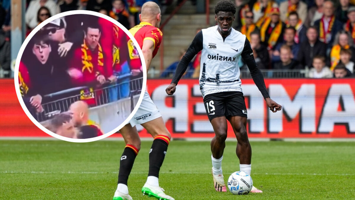 Tribunetokkie frontaal in beeld: man maakt apengebaren naar Ghanese AZ-speler