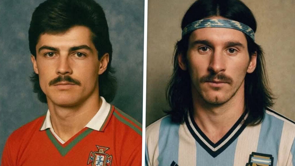 Voetbalsterren uit 2025 dankzij AI terug naar de jaren 80; compleet met matje en snor