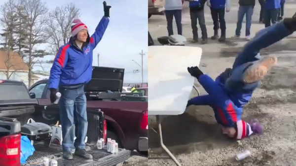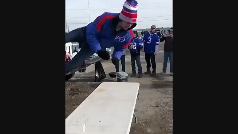We weten langzamerhand wel dat dronken Amerikanen graag door tafels heen springen. Deze acrobaat zonder ruimtelijk inzicht moet alleen nog wat oefenen en helemaal op zijn landing.