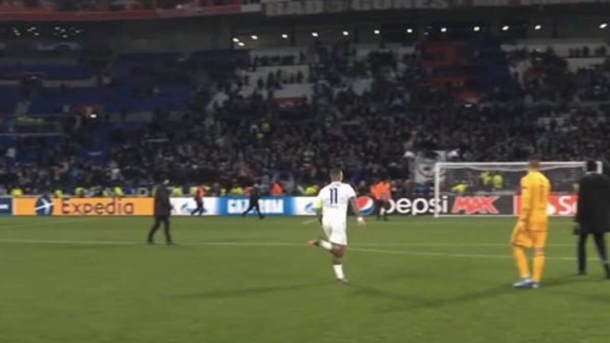 Waarschijnlijk had hij het idee om even full retard Cantona op deze supporter te gaan, maar gelukkig waren er suppoosten en medespelers die konden ingrijpen.