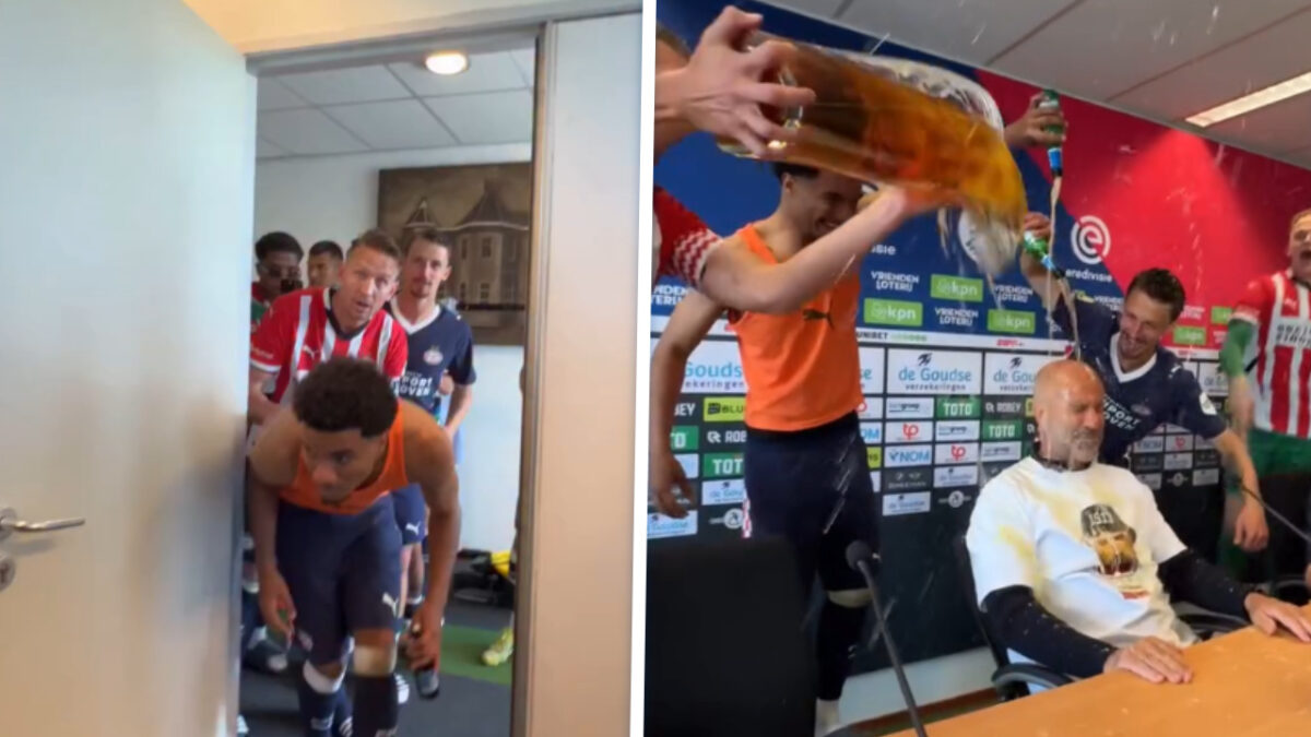 Na de 3-1 overwinning bij Sparta en het veiligstellen van de landstitel, leek PSV-trainer Peter Bosz klaar voor een serieuze analyse tijdens de persconferentie. Dat liep anders. Malik Tillman, Olivier Boscagli en aanvoerder Luuk de Jong wisten het moment te benutten voor een onverwachte bierdouche.