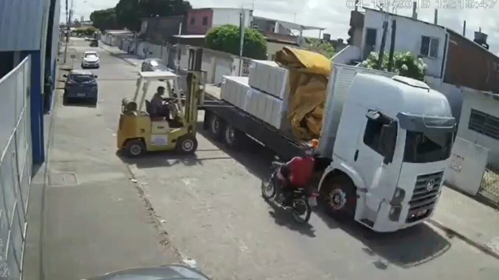 Brommerrijder heeft zijn hoofd er niet helemaal bij als hij een vrachtwagen passeert