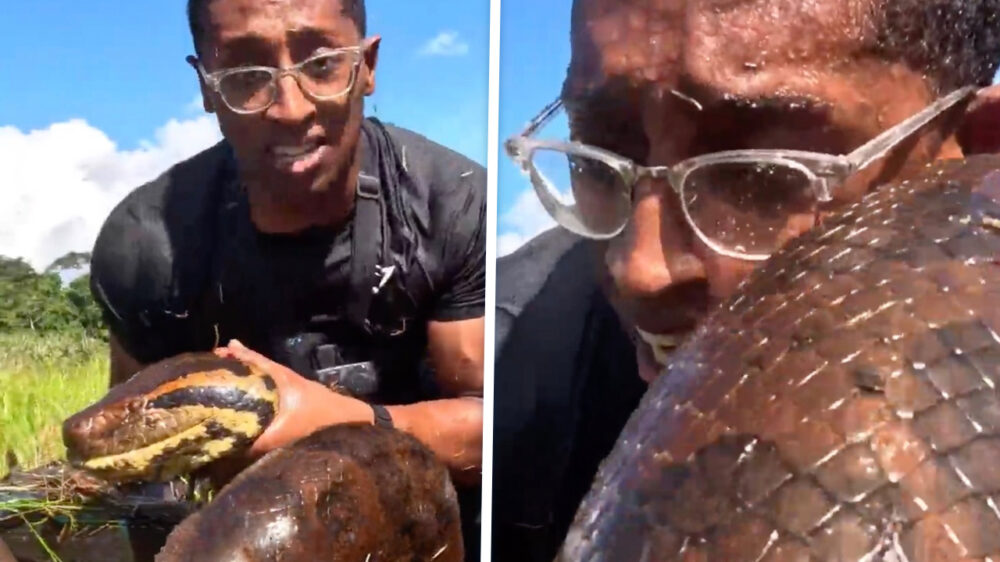 Een man met meer moed dan verstand dacht dat 'ie wel even een anaconda met zijn blote handen te kunnen temmen. Spoiler: het liep toch even net iets anders, we heten natuurlijk niet allemaal Freek Vonk.