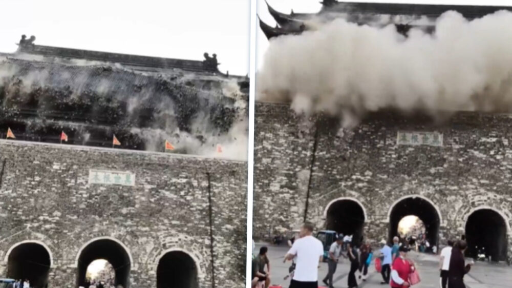 Maandag ging het goed mis bij de Fengyang Drum Tower in de Chinese provincie Anhui. Honderden dakpannen braken plotseling af en vielen van een hoogte van twee verdiepingen naar beneden. Het moment werd vastgelegd op video: een wolk van bruine stof doemde op terwijl toeristen in paniek wegrenden van het instortende gebouw. Gelukkig vielen er geen gewonden.