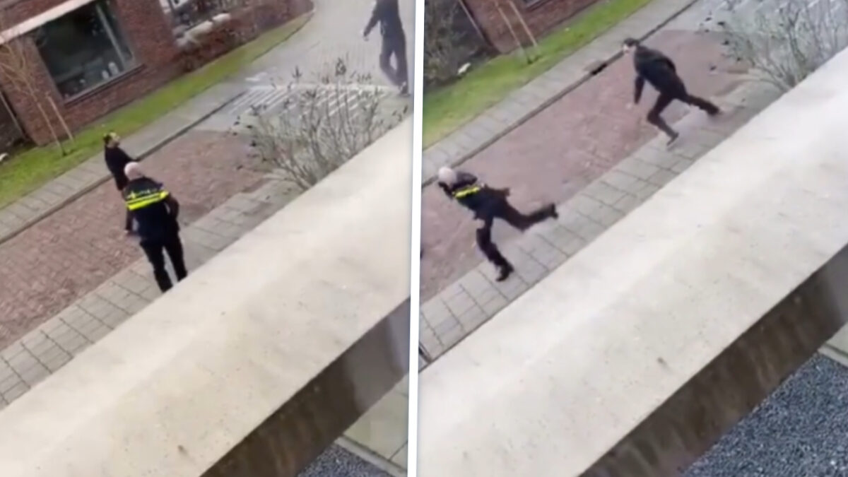 Een vrouw filmt hoe zich voor haar raam een mislukte arrestatie afspeelt. Een paar agenten cirkelen als trage strontvliegen om een verdachte die, gewapend met iets wat op een breekijzer lijkt, de politie probeert te lijf te gaan. Het tafereel is pijnlijk knullig en het vertrouwen in justitie krimpt met elke voorbijgaande seconde. Gelukkig staat het hele circus keurig op beeld. Ondertussen klinkt op de achtergrond een geluid dat verdacht veel lijkt op een koter die zich verslikt. In de reacties regent het kritiek: “Filmen is blijkbaar belangrijker dan je stikkende kind op de achtergrond.” Ach ja, views zijn ook wat waard.