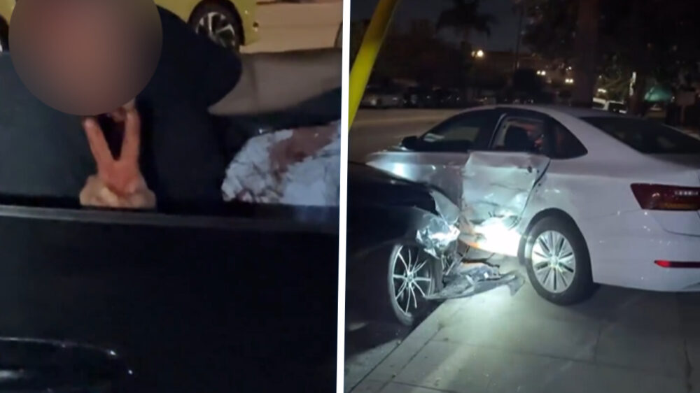 Een flink benevelde bestuurder is in Los Angeles door rood gereden terwijl twee voetgangers overstaken. Hij ramde een geparkeerde auto, die door de klap over de stoeprand werd gelanceerd. Wonder boven wonder raakte niemand gewond. De bestuurder, wiens bloed over zijn gezicht sijpelde, probeerde daarna tevergeefs zijn wrak te starten om te vluchten.