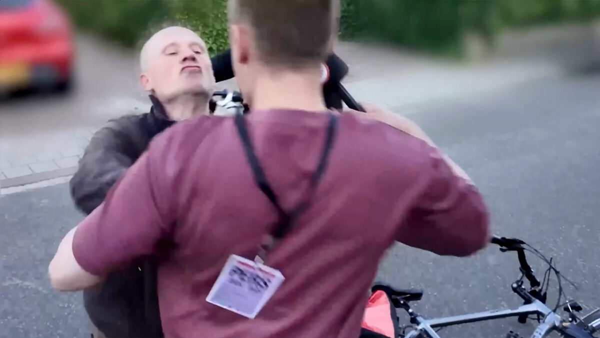 Volkert, die niemand meer koud heeft gemaakt sinds 2002 (best een prestatie), had duidelijk geen zin om moeilijke vragen te beantwoorden waarna hij knullig van zijn fiets valt en daarna met minder knulligheid de cameraman aanviel.