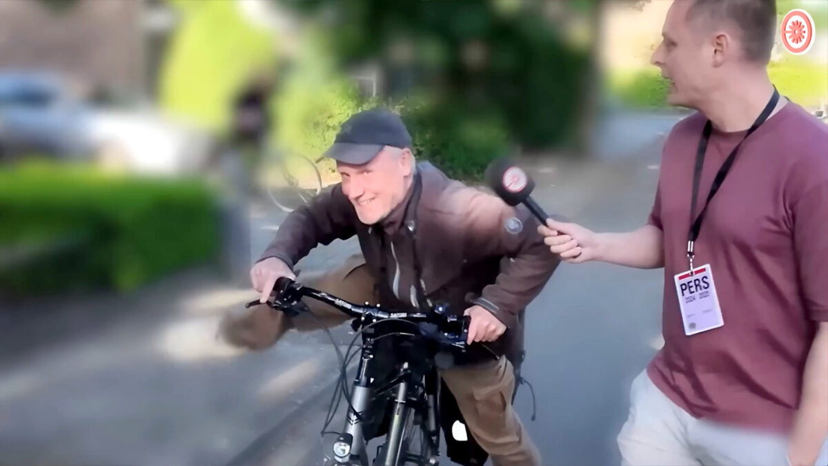 Volkert, die niemand meer koud heeft gemaakt sinds 2002 (best een prestatie), had duidelijk geen zin om moeilijke vragen te beantwoorden waarna hij knullig van zijn fiets valt en daarna met minder knulligheid de cameraman aanviel.