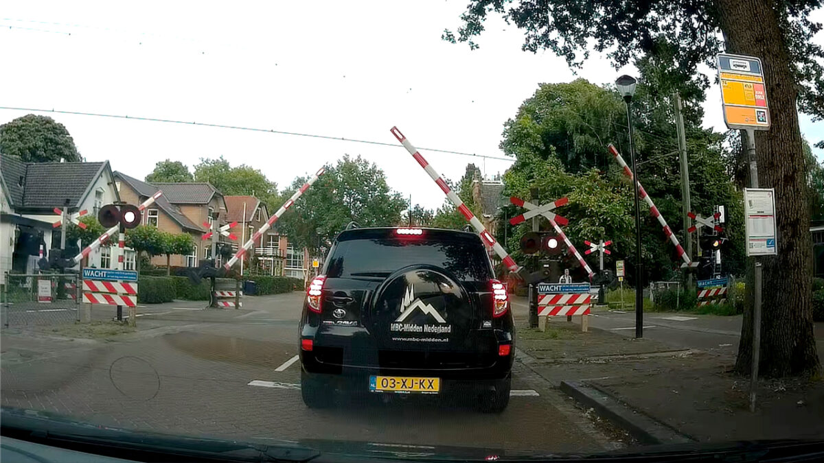 Net op het moment dat de spoorbomen beginnen te stijgen, trapt deze haastige Tokkie het gaspedaal zowat door z’n vloerplaat.