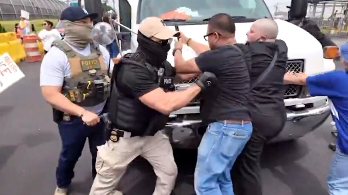 Complete chaos bij een gevangenis in Newark, waar een groep furieuze activisten besloot zichzelf letterlijk voor de motorkap van een rijdend busje te gooien alsof het een scène uit een lowbudget actiefilm was. Activisten en families van ICE-gevangenen eisen hun vrijlating uit het detentiecentrum in New Jersey.