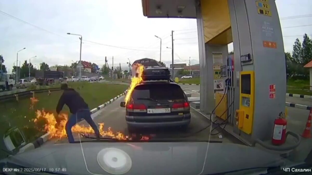 Hersenloze Rus blaast bijna zijn auto op tijdens het tanken