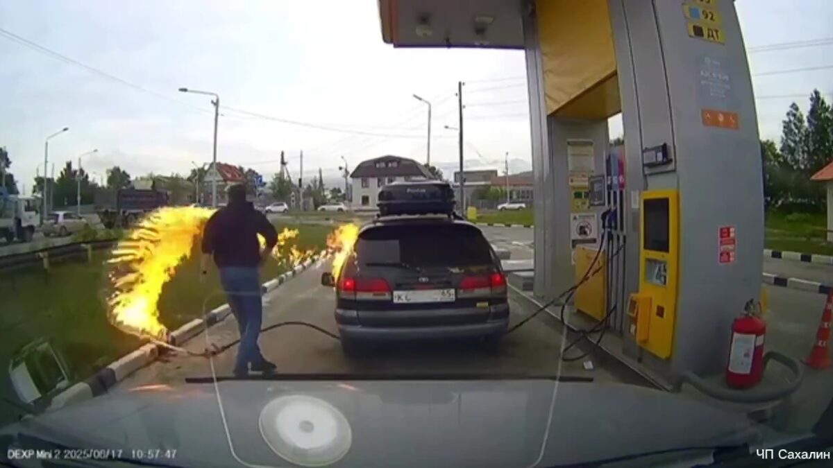 Hersenloze Rus blaast bijna zijn auto op tijdens het tanken