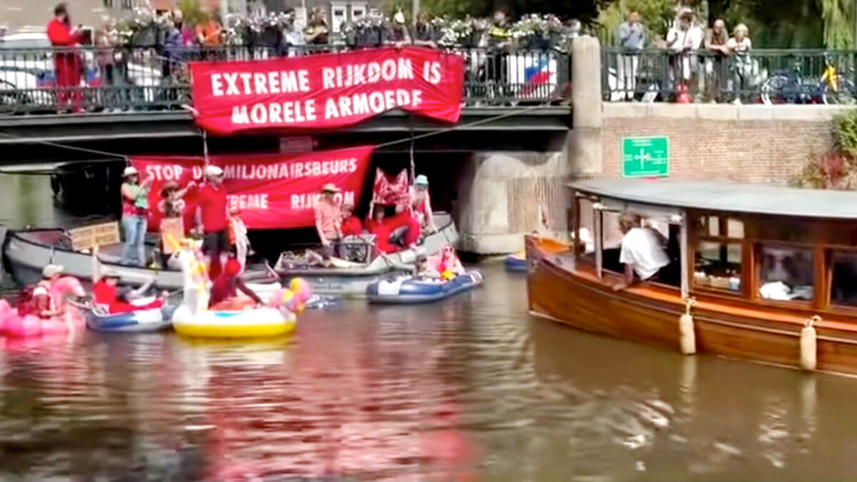 Tijdens de boottocht van miljonairsbeurs Masters Expo in Amsterdam doken donderdag ineens een stel klimaatactivisten van Extinction Rebellion op die vonden dat het allemaal wel wat minder feestelijk mocht.