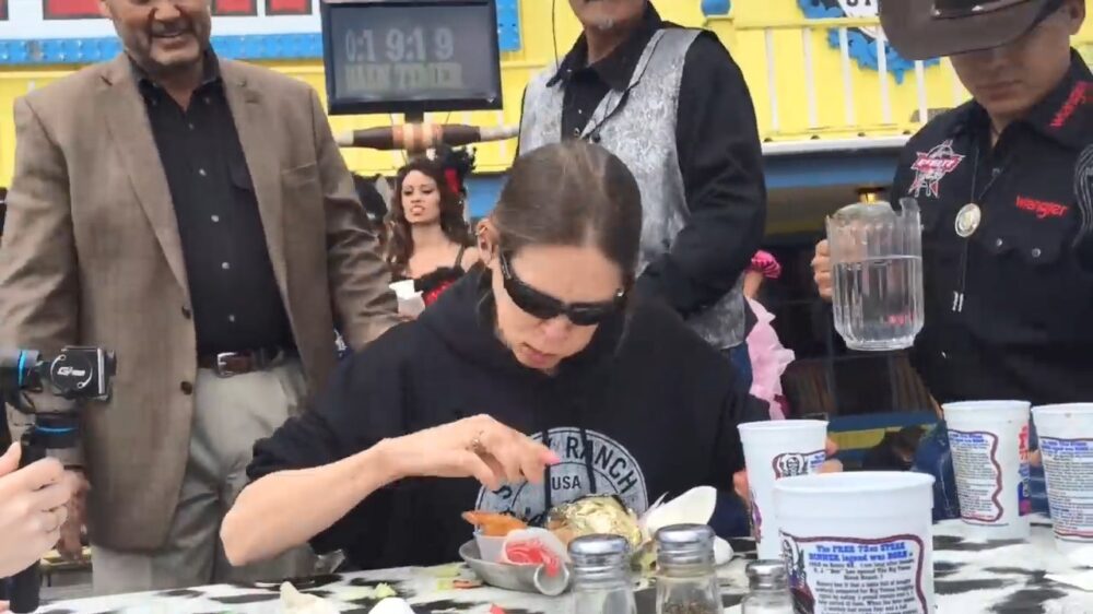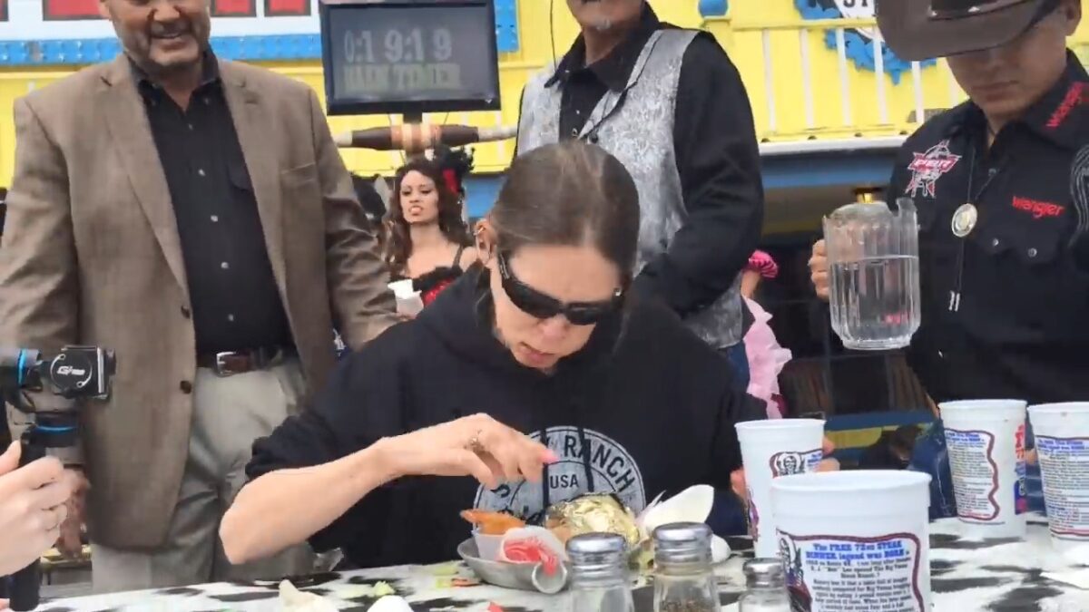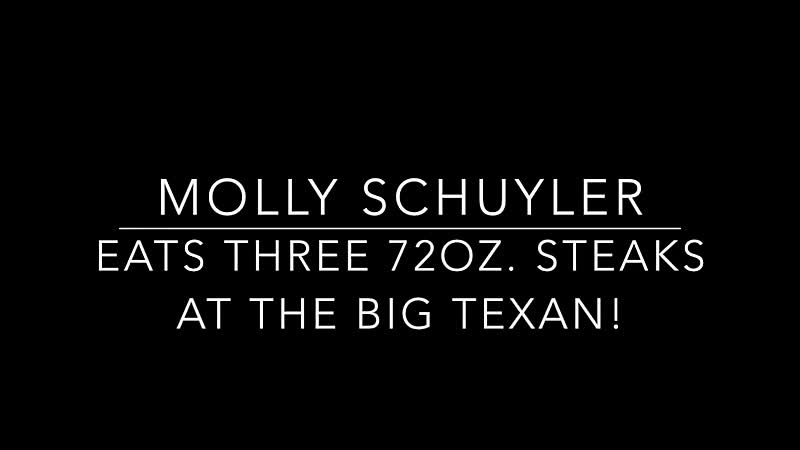 Wedstrijdeter Molly Schuyler weegt iets van 55 kg en ze verslindt even 3 x steaks (6 kg in totaal), 3 broodjes, 3 salades en 3 garnalencocktails in minder dan 20 minuten. Waarschijnlijk had ze trek!
