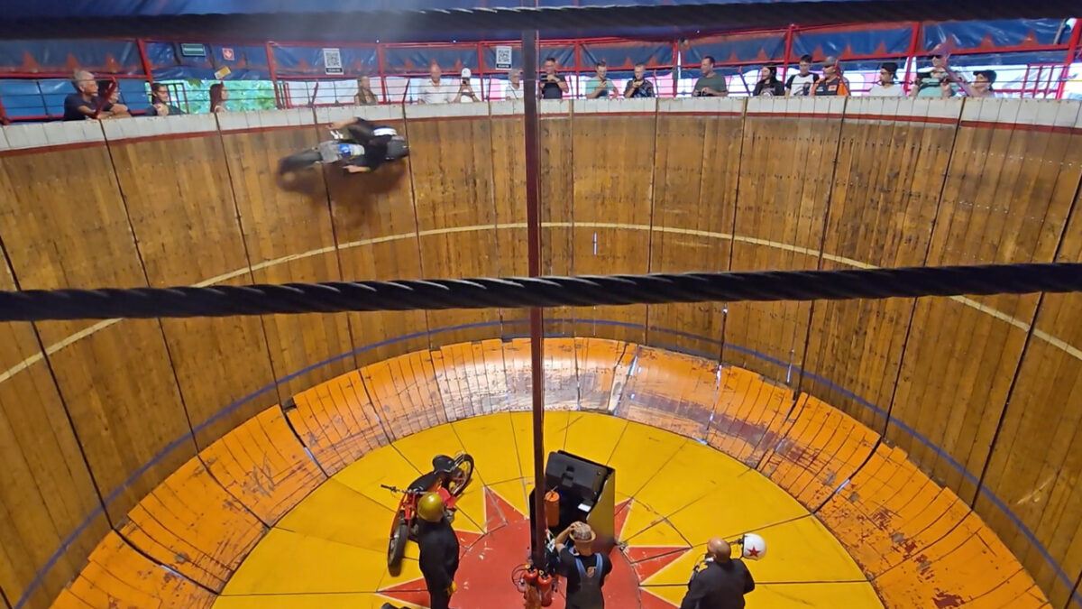 Stuntmotor in de Wall of Death gaat ondersteboven op de kermis van Uden