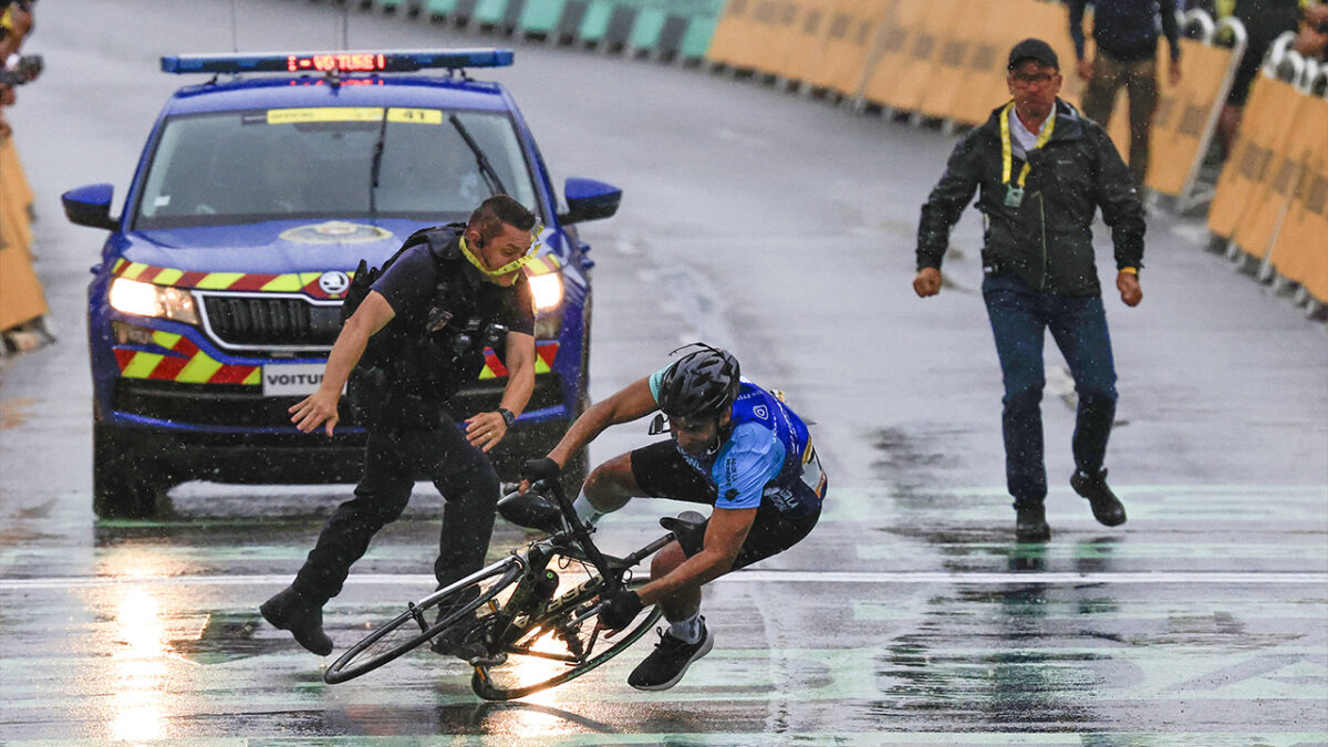 Een medewerker van de organisatie probeerde hem tegen te houden, maar kreeg slechts een voorbijflitsende wannabe-renner te zien. Het was uiteindelijk een Franse oproeragent die het karwei professioneel afmaakte: een bodycheck uit het boekje en klaar. Geen renners onderuit, geen chaos. Gewoon een boom van een agent die even liet zien waar de streep écht ligt.