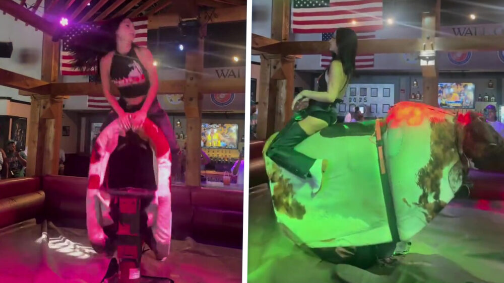 Normaal zien we op zo’n mechanische stier vooral bezopen types die zich voor schut zetten en met hun kruis een whiplash oplopen. Maar deze keer niet, want deze dame weet verdomd goed wat ze doet en blijft zitten alsof ze ermee vergroeid is.