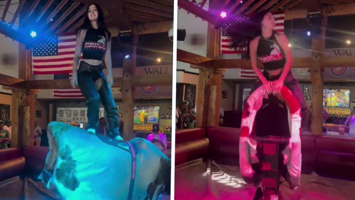 Normaal zien we op zo’n mechanische stier vooral bezopen types die zich voor schut zetten en met hun kruis een whiplash oplopen. Maar deze keer niet, want deze dame weet verdomd goed wat ze doet en blijft zitten alsof ze ermee vergroeid is.