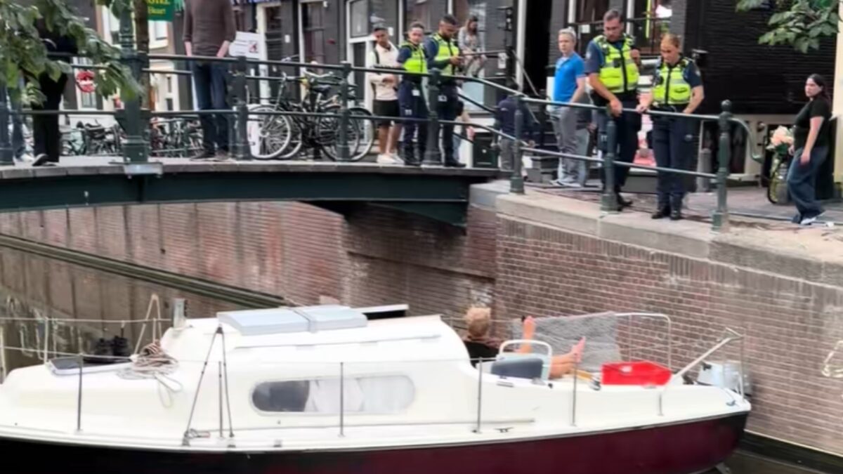 In Amsterdam heeft een man z’n sloep strategisch geparkeerd dwars over de gracht. Terwijl de vaarruimte volledig geblokkeerd is, ligt hij erbij alsof hij op Ibiza op een Aperol Spritz wacht. Toeterende bootjes, gefrustreerde schippers en een rij agenten aan de kant: de beste man verroert geen vin.