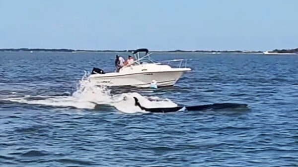 Een walvis is dit weekend dood teruggevonden in ondiep water bij de kust van New Jersey, na een 'aanvaring' met een motorboot. De klap was zo lomp dat de boot bijna omsloeg en iemand overboord viel. Beelden op sociale media laten een schommelende boot zien, een spartelende walvis en iemand die watertrappend probeert te overleven naast de chaos.