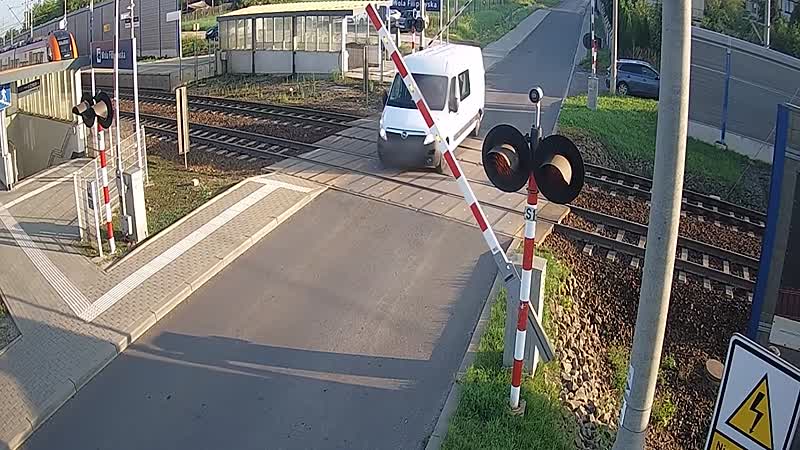 In het Poolse Wola Filipowska heeft een bestuurder van een witte Opel bestelbus op 1 augustus een botsing met een intercitytrein overleefd. De man reed bij de spoorwegovergang aan de Kolejowa-straat doodleuk door het rode licht en parkeerde zijn busje precies tussen de dalende slagbomen.